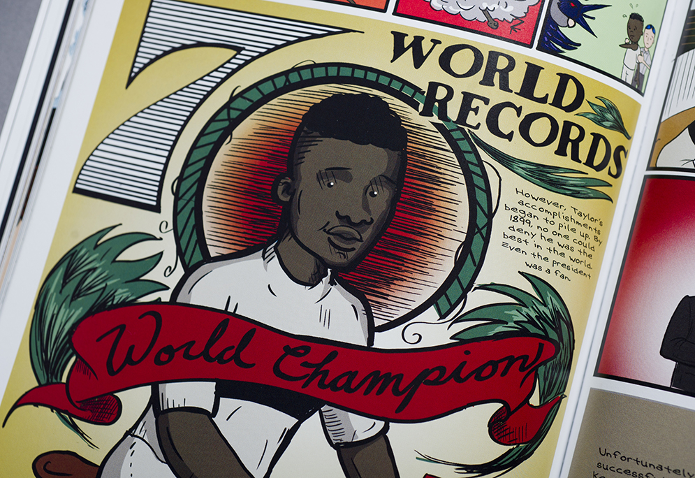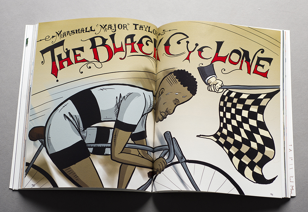 Jiménez also admires Gill’s artistry, his “use of full, rich color in his work. He uses a palette that underscores the sort of old-timey history he is writing about.” In telling the story of Major Taylor, a fin de siècle cyclist who was America’s first black sports champion, Gill varies the skin tone in his pictures of Taylor’s family, even though they all were related. “You’d be surprised at how often illustrators color characters of similar races…the same color,” says Jiménez. “As if there is a single color grade for any group of people.”
