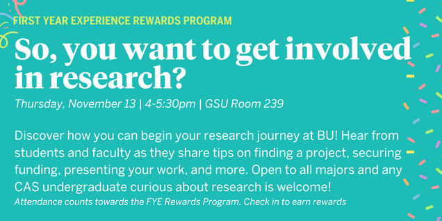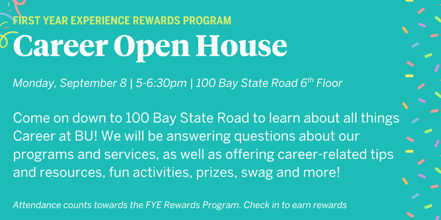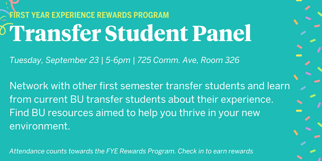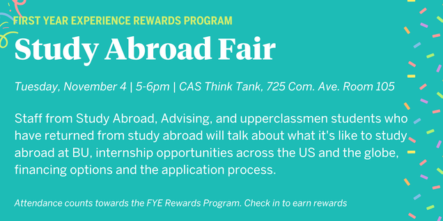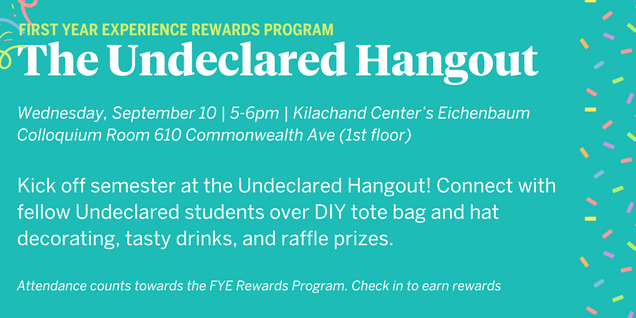These events are meant to help our newest undergraduates, both first-years and transfer students, transition into the intellectual, social, and cultural community of Boston University. The more events you attend, the more rewards you are eligible to receive. All students are welcome to attend; rewards program is limited to CAS First-Years, CAS First Semester Transfers, and all students enrolled in FY101.