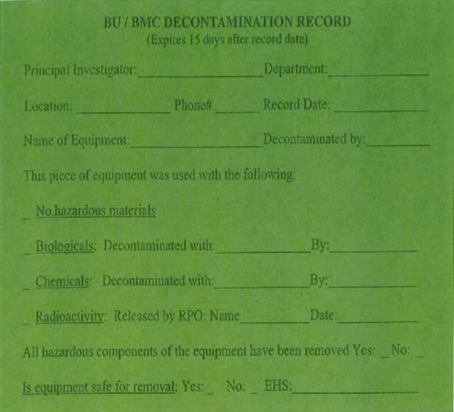 Every piece of decontaminated laboratory equipment requires a “Decontamination Record” label prior to move. The following describes the appropriate label to be used. These labels may be obtained from the EHS Departmental Safety Advisor (DSA) after completing the Equipment Decontamination Certification Form. Note: This label is good for 15 days only, so coordination and pre-planning is important.