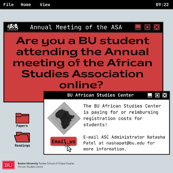 BU Students are eligible to get their registration fee for the Annual Meeting of the African Studies Association covered by the ASC. If you have yet to register you can email us to pay the registration fee for you, or if you have already paid you can email us the receipt for reimbursement. Available funding is limited. Email Natasha Patel at nashapat@bu.edu for help with this process.