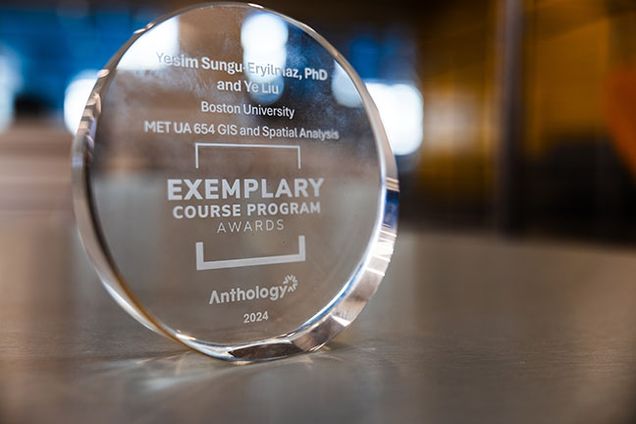 Our Program Director, Dr. Yesim Sungu-Eryilmaz, was awarded the Anthology Exemplary Course Program Award along with Boston University Instructional Designer, Ye Liu, for their work on the MET UA 654 (now MET UA 598) GIS and Spatial Analysis course. The Exemplary Course Program award recognizes the excellence in course design demonstrated by faculty and designers. The core of the program is the Exemplary Course Rubric, which defines key characteristics of high-quality courses within the framework of Course Design, Interaction and Collaboration, Assessment, and Learner Support.