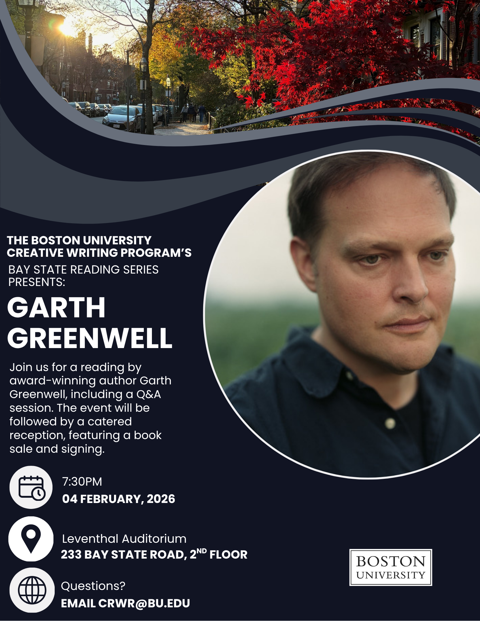 The next Ha Jin Visiting Lecturer Event, featuring PEN/Faulkner Award-winning author Garth Greenwell, will take place on Wednesday, 4 February at 7:30PM in the Boston University Leventhal Center Auditorium (2nd Floor, 233 Bay State Road, Boston, MA). Garth will give a reading and participate in an audience Q&A. A catered reception and book signing will follow the reading in the BU Castle (225 Bay State Road); books will be available for sale and Garth will sign books.