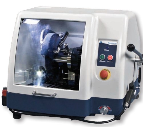| Any material large enough to hold, as long as you put the correct abrasive wheel on. Typically used for metallography samples and rocks. | Correct diamond blade must be installed. Cut small samples you want slices of. Has a micrometer for sample thickness. Typically used for metallography samples. |