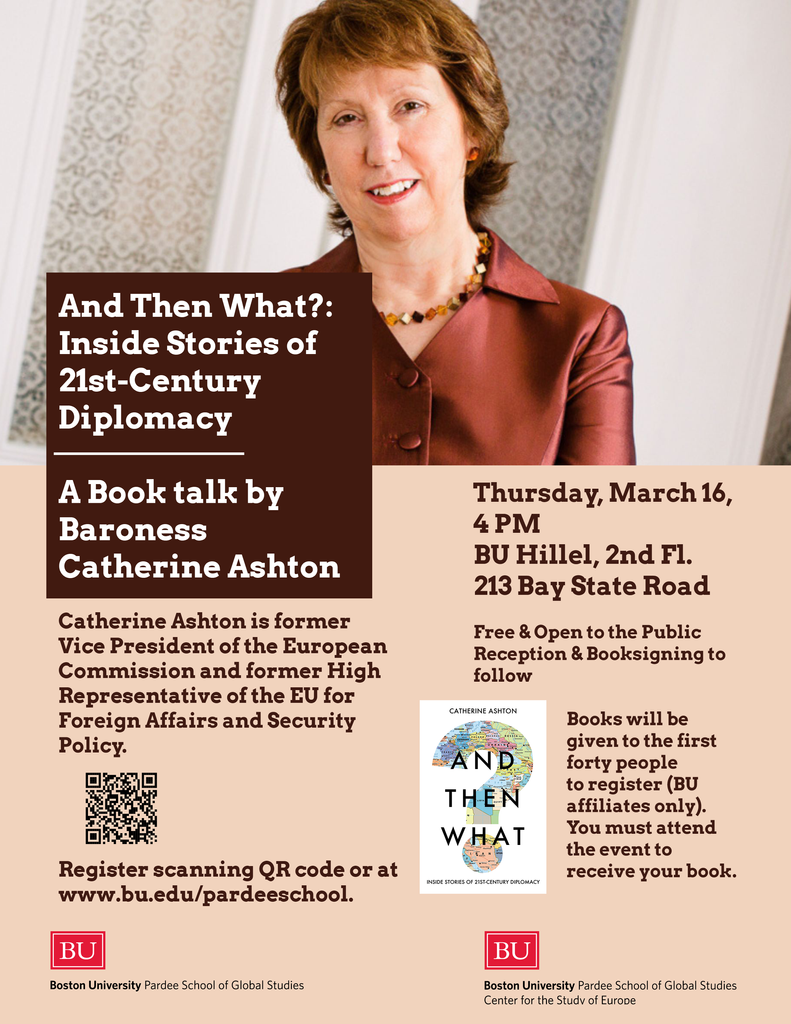 The Pardee School, the Center for the Study of Europe, and the Wilson Center are excited to host Baroness Catherine Ashton for a discussion on her latest book And Then What?: Inside Stories of 21st Century Diplomacy.