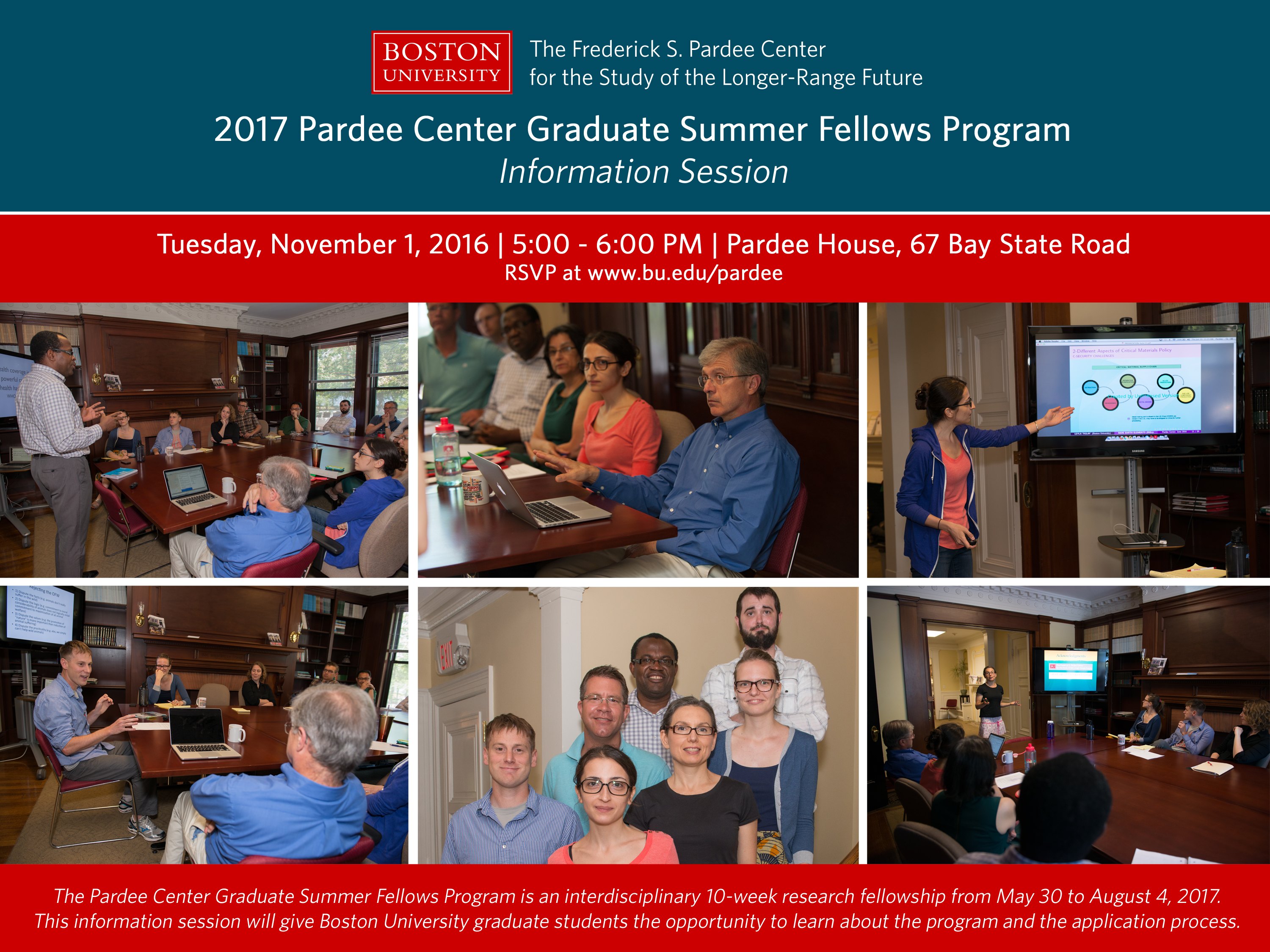The Frederick S. Pardee Center for the Study of the Longer-Range Future invites Boston University graduate students interested in applying for our 2017 Graduate Summer Fellows program to an information session at the Pardee House, 67 Bay State Road, on Tuesday, November 1 from 5:00-6:00 pm. Seating is limited and advance registration is required by Friday, October 28. Click here to RSVP.