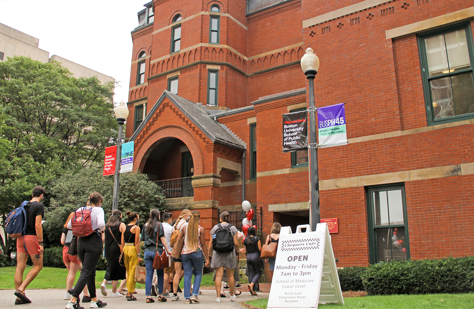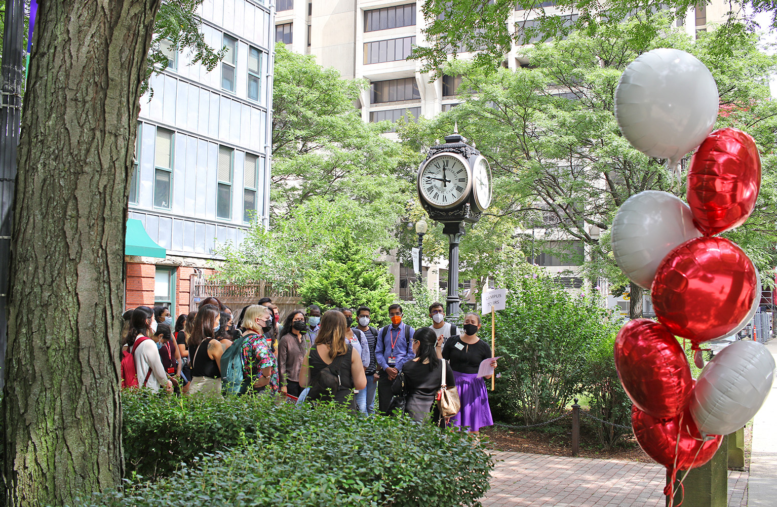 A tour gathers under the Boston University Medical Campus clock, an iconic meeting point for generations of students.