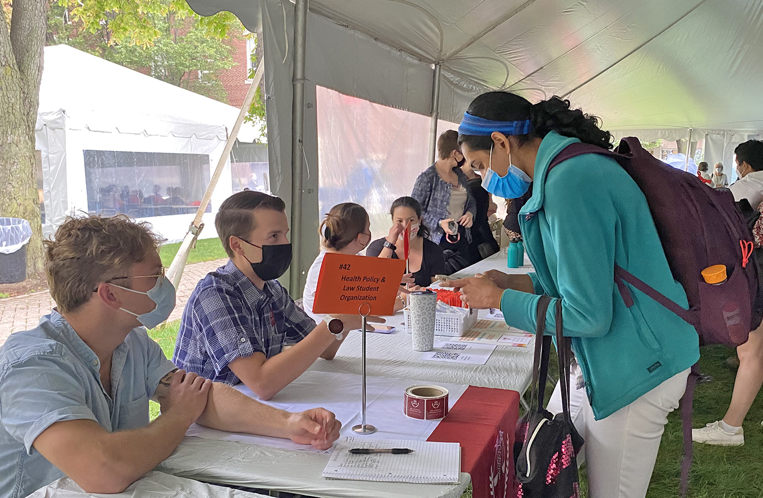 Student organization members greet new colleagues at a resource fair co-sponsored by SPH and Graduate Medical Sciences