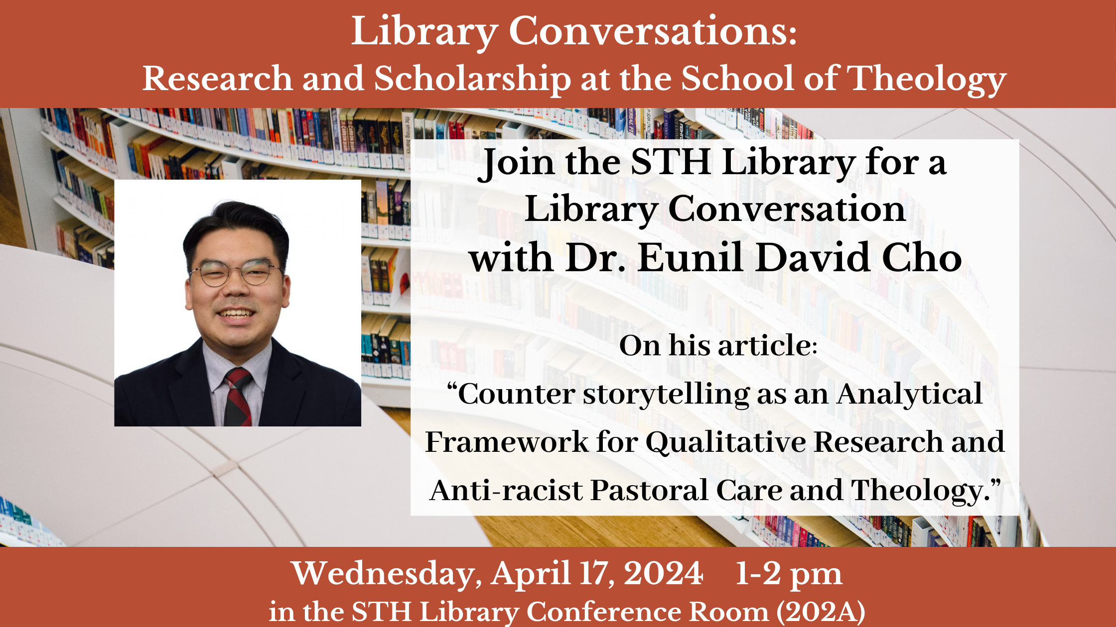 Our April Library Conversations event will focus on the scholarly work of Dr. Eunil David Cho. A faculty member of the School of Theology, Dr. Cho is Assistant Professor of Spiritual Care and Counseling. His research and teaching interests address the intersections of racism, culture, and faith; as well as aesthetic teaching and learning, creativity, and embodied knowing.