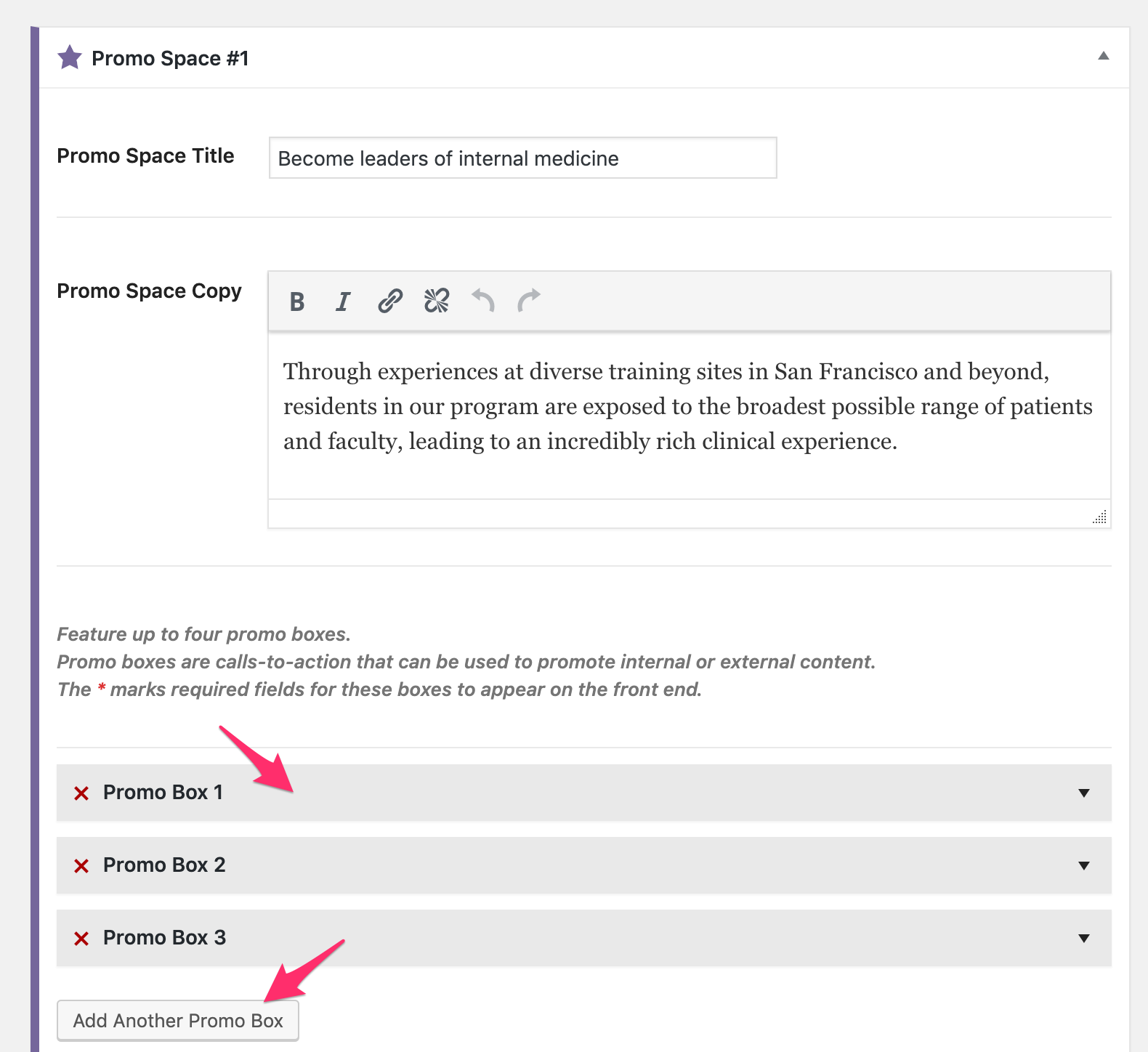 In order to fill out the metaboxes for an individual promo box, click into the dropdowns or Add Another Promo Box, and then do so: