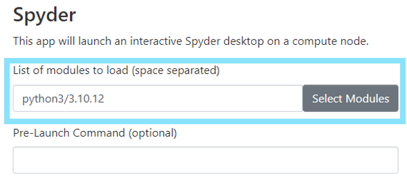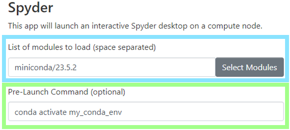 spyderin your conda environment for the kernel to be available in the IDE. This is done with the following:[rcs@scc1 ~] conda activate my_conda_env (my_conda_env) [rcs@scc1 ~] pip install spyder - On the Spyder request page, specify the version of Miniconda you need in the List of modules to load (space separate) field AND add the command to source your environment under the Pre-Launch Commands field (optional). This will setup environment variables to associate the proper resources for your session and set the python interpreter. Click Launch to submit the request.