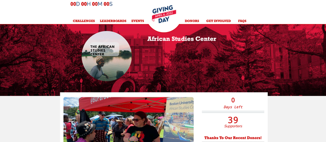 Thank you to everyone who gave to the ASC on Giving Day 2022. With your support we received 39 gifts totaling in $1,470. Your participation made us the Pardee School affiliated Center with the most donors, which earned us a bonus of $2500.00. Gifts to the ASC are used to help support students embarking on research, presentations, or language programs to further their education and professional experience in African studies. Thank you for helping us support our students.