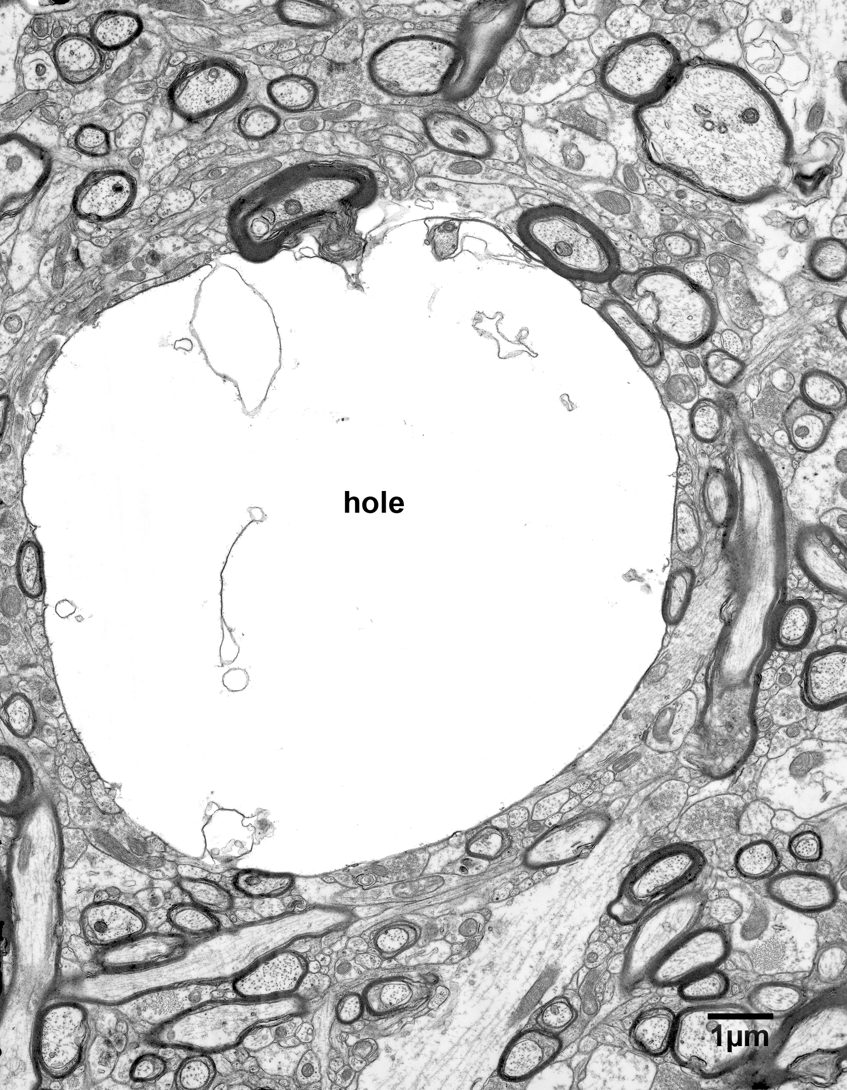 Fig. 15.5. A large, 10 micron diameter, hole in layer 6 of the superior temporal gyrus of 35 year old monkey. As in the previous examples, a membrane surrounds this hole, and its contents are probably under pressure since the hole is causing distention of the surrounding neuropil.