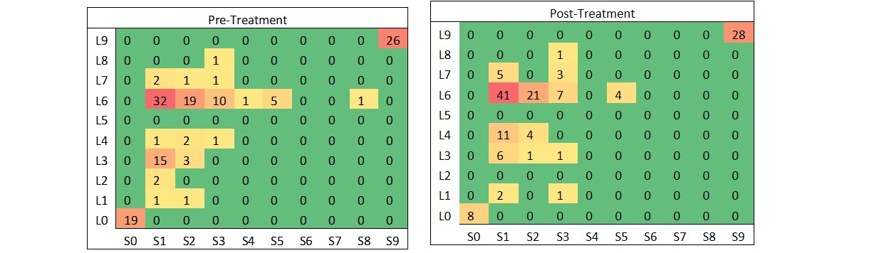 These scores offer insight into the nature and degree of breakdown in print processing, while also allowing us to see changes as a result of treatment beyond what is captured by a correct/incorrect scoring paradigm. One capacity of the DRES system is to generate an error profile for each patient. This is done by plotting each response as a point on a graph, using the sublexical and lexical scores as x and y coordinates. A nonresponse is indicated by the bottom left corner (S0, L0), while a correct response is in the top right (S9, L9).  ross-figure-2It is possible to see from these results that the patient only experienced a small increase in correct responses (+2), however, substantial lexical and sublexical improvements can be evaluated with this system. DRES results reflect significant treatment effects, unique error profiles and specific error evolutions, and categorical error shifts in group-level analysis. The results of this study indicate that treatment-induced evolution of reading/writing can be meaningfully and comprehensively represented by this novel scoring system.