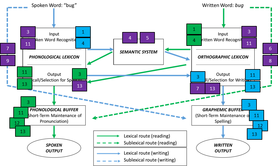 Alignment between treatment steps (numbered boxes) and the processes they target in the dual-route model. Green indicates steps within the reading treatment protocol, blue indicates steps within the writing treatment protocol, and purple reflects steps within both protocols.