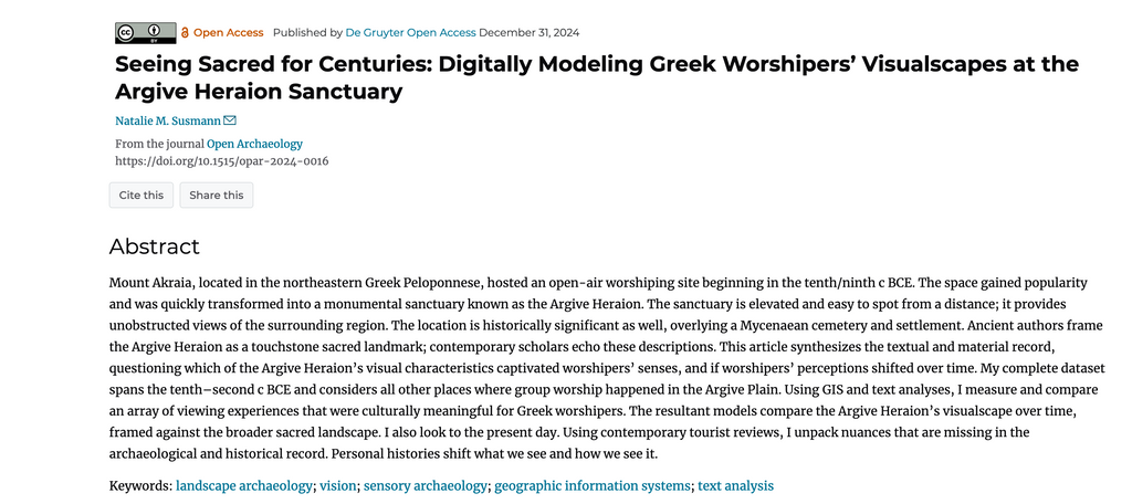 Natalie Susmann has just had a fantastic article on modeling visualscapes at the Argive Heraion in Greece come out in an open access journal. Here’s the official publication of the article.