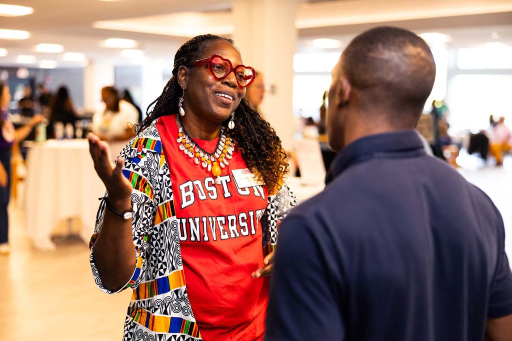 Nikita McCalister (STH’05) (left) chats with Justin Flynn, chair of the Young Alumni Council during the celebration for Black alumni. Photo by Jake Belcher