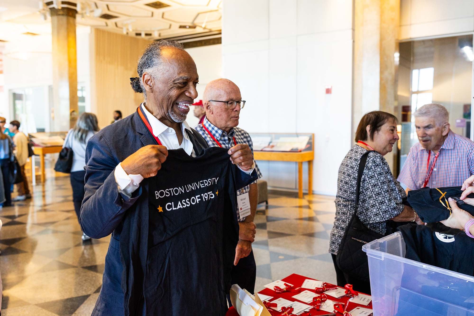 Harold du Four-Anderson (COM’75, Wheelock’78) picks out his Class of 1975 T-shirt at the brunch for Golden Terriers. Photo by Jake Belcher