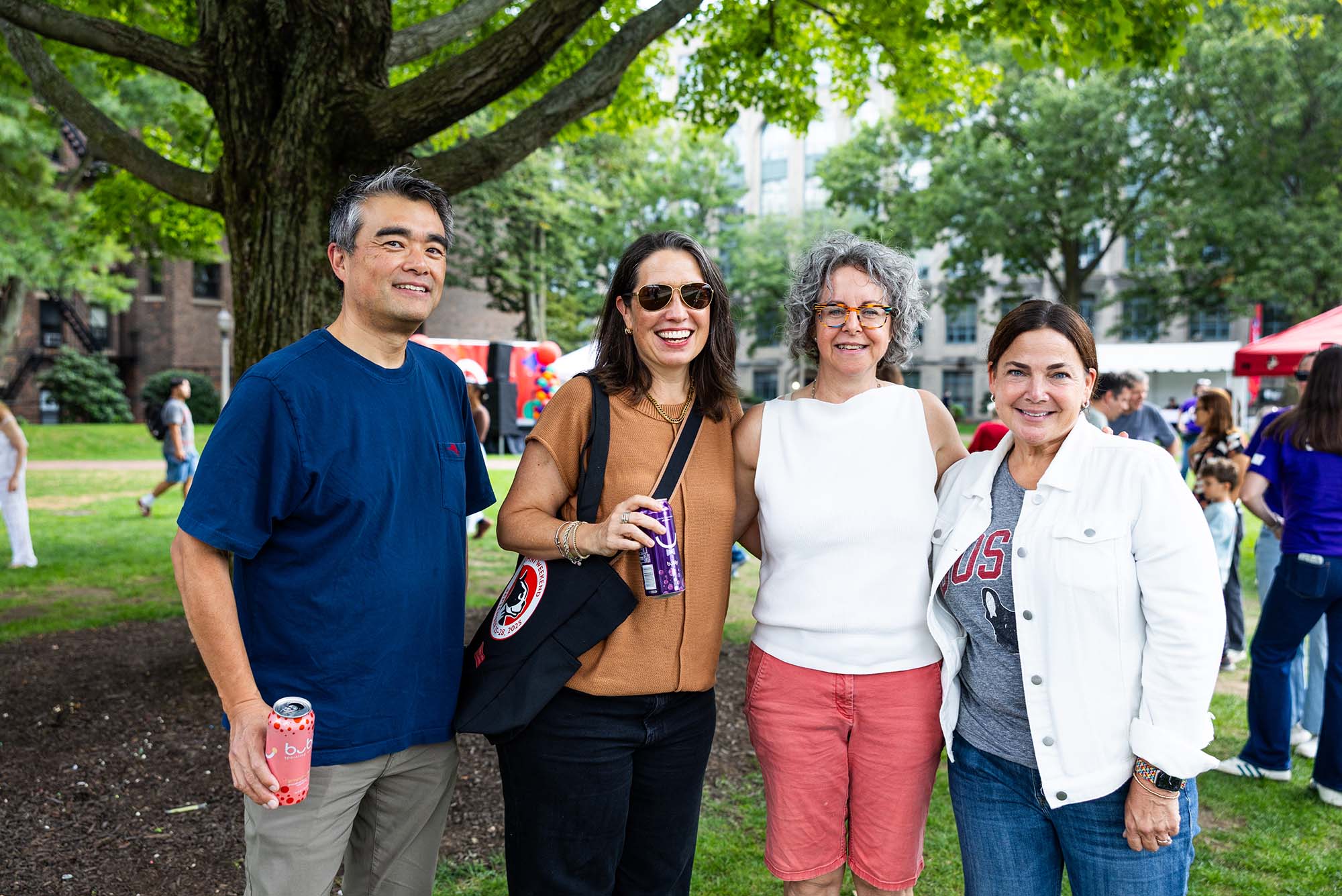 Wako Iwasaki (ENG’93) (from left), Lisa Mathews-Iwasaki (COM’93), Jody Tick (CAS’93), and Diana McGivney Slavin (Wheelock’93) at the Back to BU Beach Festival. Photo by Michael D. Spencer