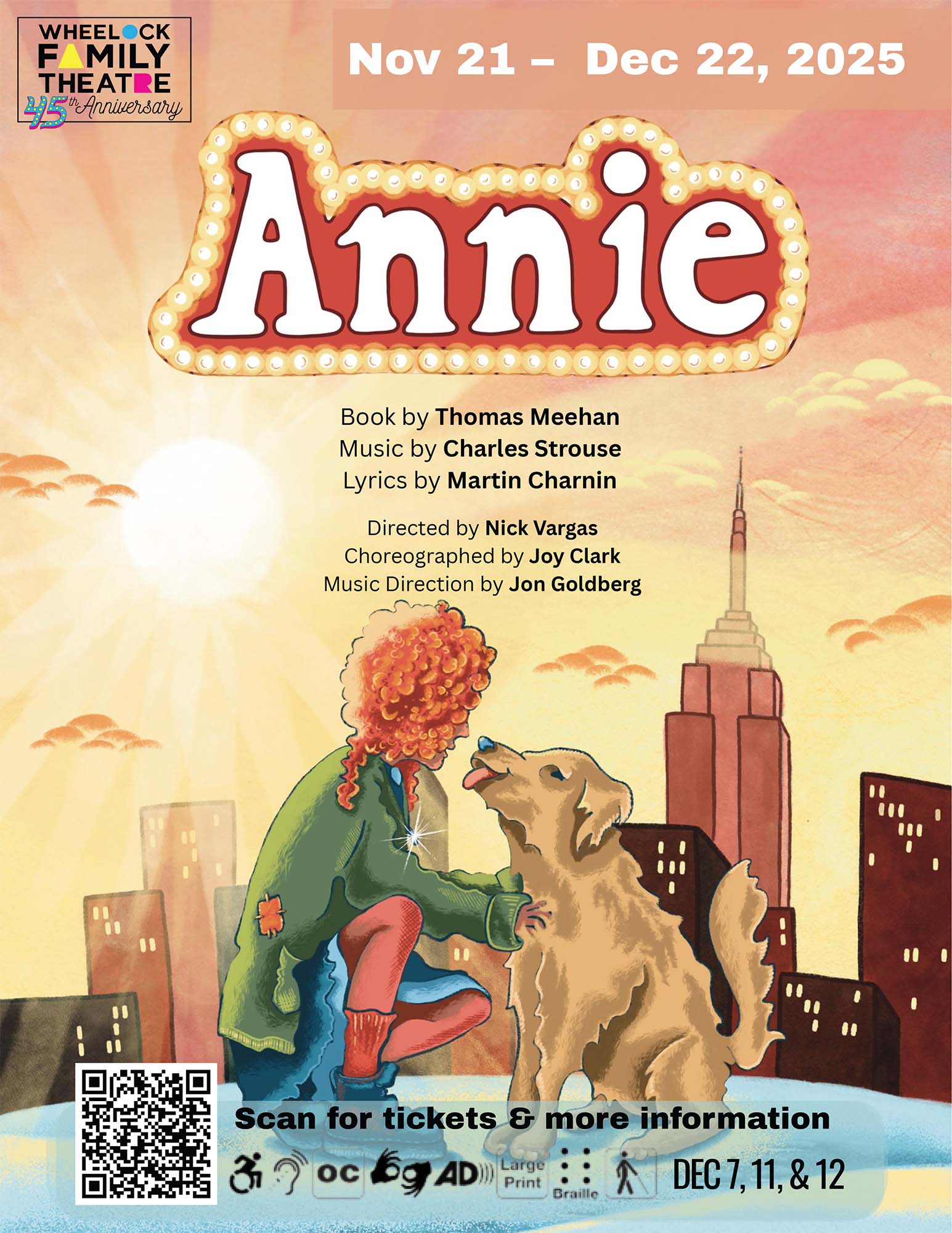 Annie runs November 21 through December 22 and Charlotte’s Web runs April 1 to 26, 2026. Magic in the Wings: A Benefit Celebrating 45 Years of Wheelock Family Theatre is Thursday, December 4, at 5:30 pm at Wheelock Family Theatre.