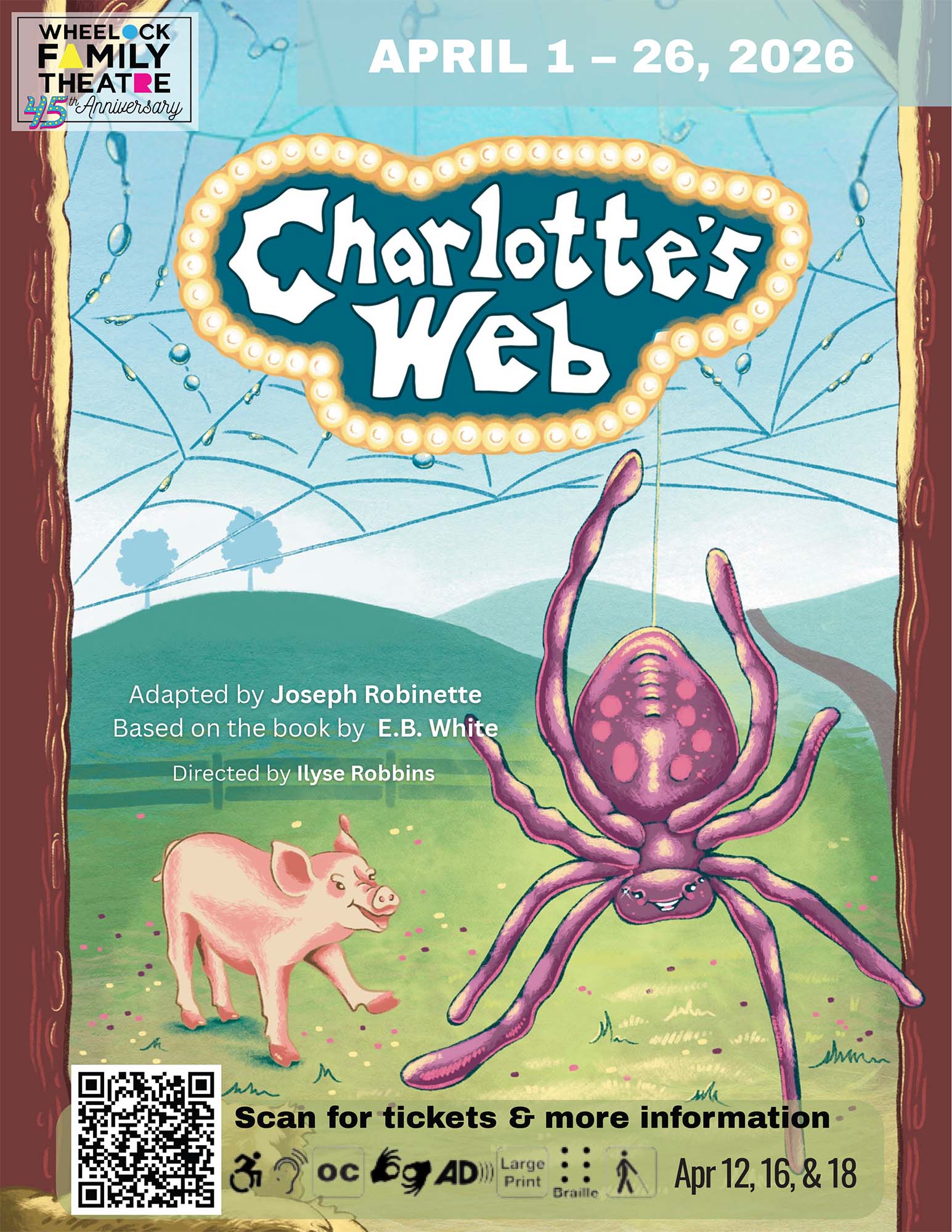 Wheelock Family Theatre’s season will continue with a production of the Tony Award–winning musical Annie (November 21 through December 22), and an adaptation by Joseph Robinette of E. B. White’s classic story Charlotte’s Web (April 1 through 26).