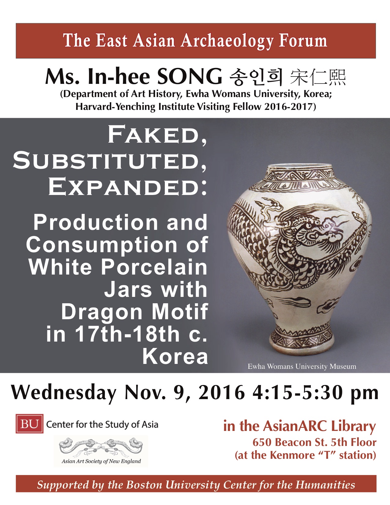 The East Asian Archeology Forum: Faked, Substituted, Expanded: Production and Consumption of White Porcelain Jars with Dragon Motif in 17th-18th c. Korea DATE: Wednesday Nov. 9 TIME: 4:15 PM-5:30 PM LOCATION: 650 Beacon Street, 5th Floor