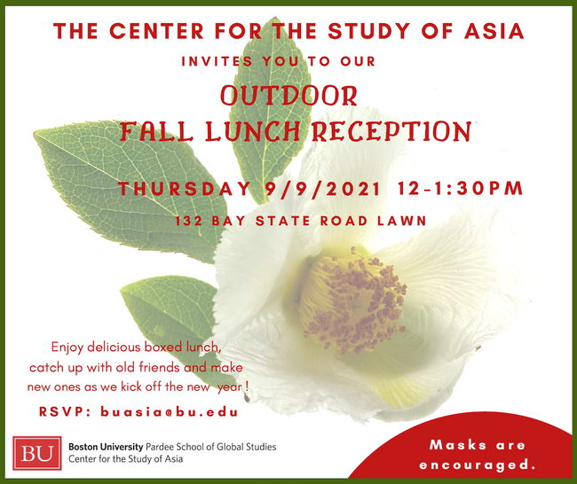 Join your Asian Studies colleagues and friends for the BUCSA fall reception! Please RSVP at buasia@bu.edu so we can order the appropriate number of box lunches. See you there!