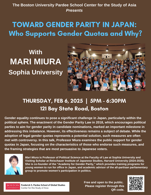 Mari Miura is Professor of Political Science, Faculty of Law at Sophia University and a Visiting Scholar at Reischauer Institute of Japanese Studies, Harvard University (2024-2025). She is co-founder of the “Academy for Gender Parity,” which provides training programs for young women to run for office and an academic advisor of the all-partisan parliamentary group to promote women’s participation in politics in Japan. Her Ph.D. is from University of California, Berkeley.