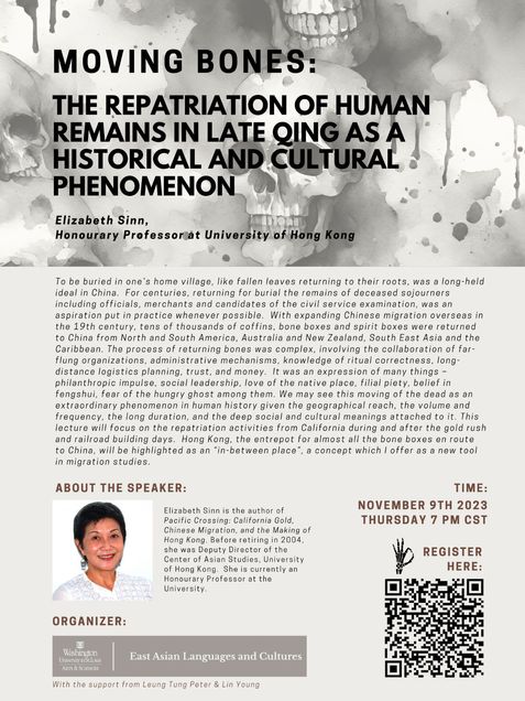 Moving Bones: The Repatriation of Human Remains in Late Qing as a Historical and Cultural Phenomenon Elizabeth Sinn Honourary Professor at Hong Kong University Thursday, Nov. 9, 2023 at 8:00 pm ET (via Zoom) To be buried in one’s home village, like fallen leaves returning to their roots, was a long-held ideal in China. For centuries, returning for burial the remains of deceased sojourners including officials, merchants and candidates of the civil service examination, was an aspiration put in practice whenever possible. With expanding Chinese migration overseas in the 19th century, tens of thousands of coffins, bone boxes and spirit boxes were returned... More