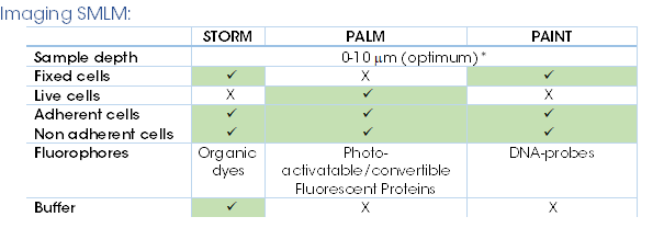The image below shows a brief table of what you can image with these three SMLM techniques. For the purpose of the demo, we only image using STORM.