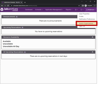 - Please switch organizations to the Micro and Nano Imaging Facility and then fill out your profile information. To do this, please select your name that is located in the top right hand corner after you have logged into LabArchives and the select switch organization. A dialog box should appear prompting you to select the organization you wish to switch to.