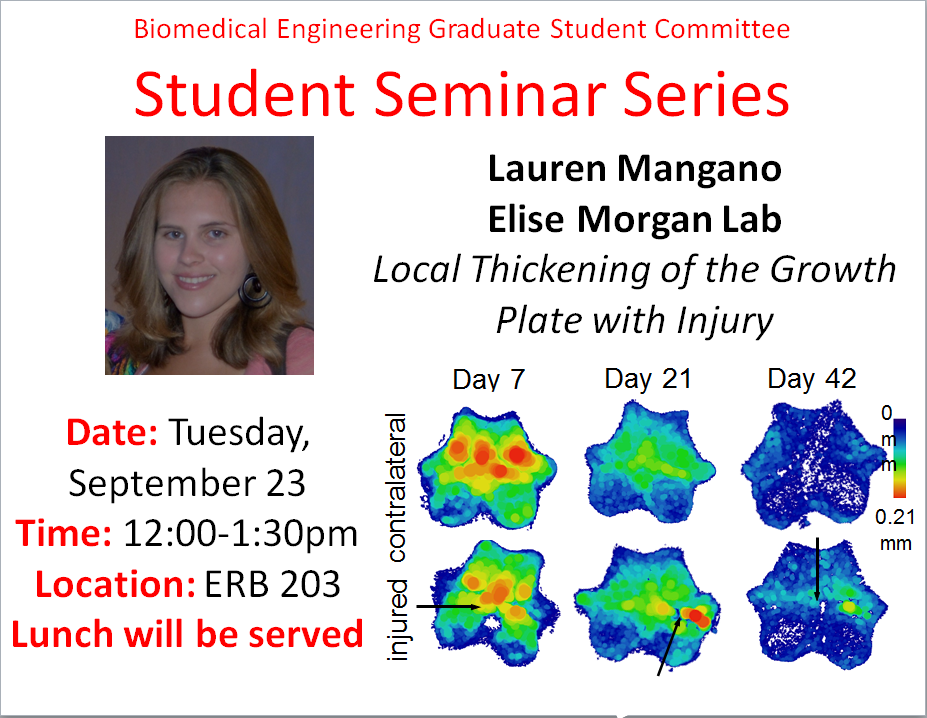 Please join us on September 22 at noon in ERB 203 for the first BME Student Seminar of the fall semester. Our goal is to create a laid-back environment where BME grad students can share their research and get feedback from their peers. Lauren Mangano will present "Local Thickening of the Growth Plate with Injury." Come by to learn about her work, provide feedback, and (of course) enjoy lunch with your peers.