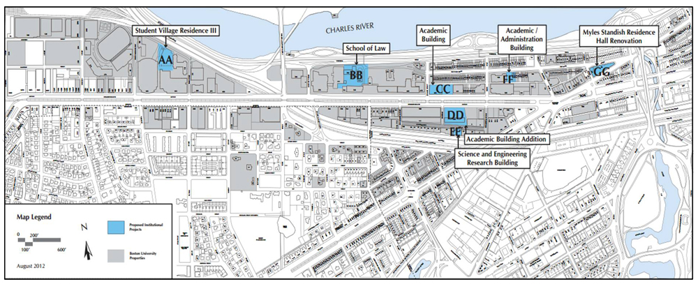 BU’s Institutional Master Plan outlines a series of major projects, from academic buildings to student housing to pedestrian malls. Click the above map to view full size. Photo courtesy of Boston Redevelopment Authority
