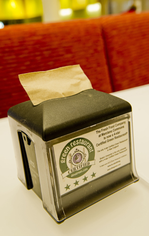 Marciano Commons’ napkin dispensers allow diners to take only one napkin at a time, another green feature.