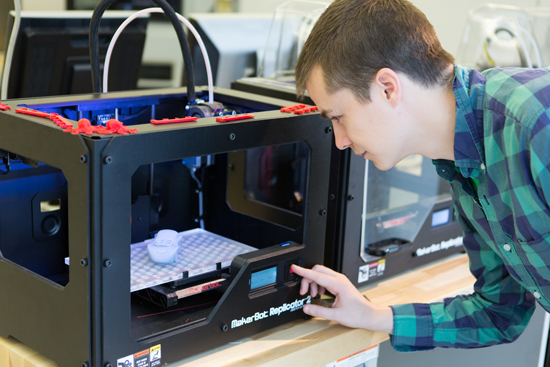 Timothy Jackman (ENG’15) with one of EPIC’s 3-D printers, which he used to create a miniature car from a digital model.