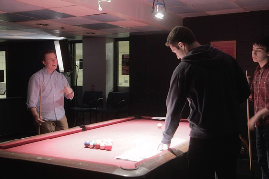 Actor John-Michael Sedor (COM’15) works with director Wes Palmer (COM’16) and actor Dario Sanchez to block a pool scene being shot in BU Central. Photo courtesy of BUTV10