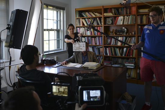 The crew of Paper Trail begins to shoot a scene between characters Professor Faust (played by Jim Powers, COM’74) and Nate Shepherd (played by Northeastern student Dario Sanchez). Photo by Salvia Fang