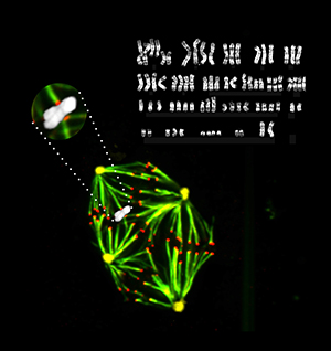 A high-resolution image of a cancer cell undergoing mitosis. In this image, a single chromosome (shown in white) is highlighted. During normal cell division, chromosomes are equally partitioned to two cells by a cellular machine called the mitotic spindle (shown in green). The mitotic spindle captures chromosomes by binding to structures termed kinetochores (shown in red). In cancer cells, this chromosome capture mechanism is commonly defective. Image courtesy of Neil Ganem