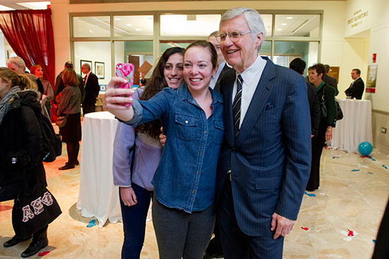 Rebecca Stiffelman (Questrom’18) (left) and Lizzie Tillow (Questrom’18) snap a selfie with BU trustee Allen Questrom (Questrom’64) at the announcement of the Questroms’ gift to BU. Photo by Cydney Scott