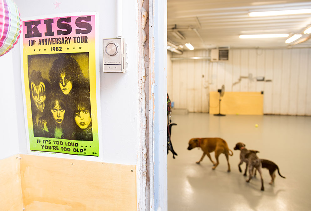 It’s controlled chaos inside Bark n’ Roll Canine Care. A dozen dogs of various sizes and breeds run laps around a room, weaving around pieces of agility apparatus, a tunnel, and buckets of tennis balls. Marty the border collie has had enough, and lies down to relax.