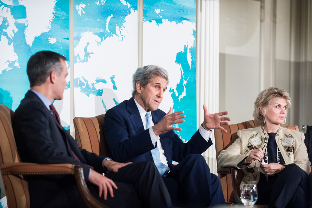 John Kerry, flanked by L.A. Mayor Eric Garcetti and Bank of America vice chair Anne Finucane, said President Trump “misled the world” in calling the Paris climate accord a costly imposition on America’s economy.
