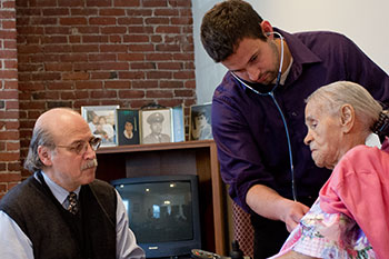 Now, Hardt watches in the darkened living room as Lucas Thornblade (MED’12) checks Swanigan’s vitals. Thornblade’s examination roams far beyond questions of blood pressure and weight. “I was going to ask how you’re doing spiritually and emotionally,” he says. “I’m not sitting here worrying,” Swanigan answers. “It’s just, it’s not fun sitting here in bed.”