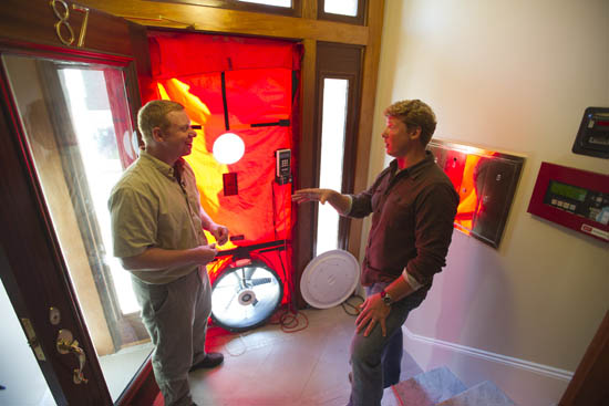 Mike Browne (left), of Advanced Building Analysis, and Kevin O’Connor (GSM’99) discuss a blower door test at 87 St. Mary’s St.