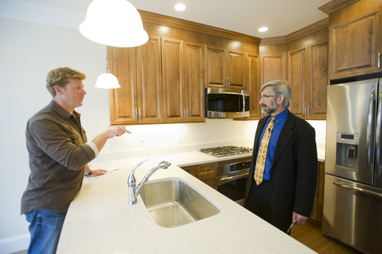 O’Connor and sustainability director Dennis Carlberg (right) tour a kitchen at 85 St. Mary’s St.