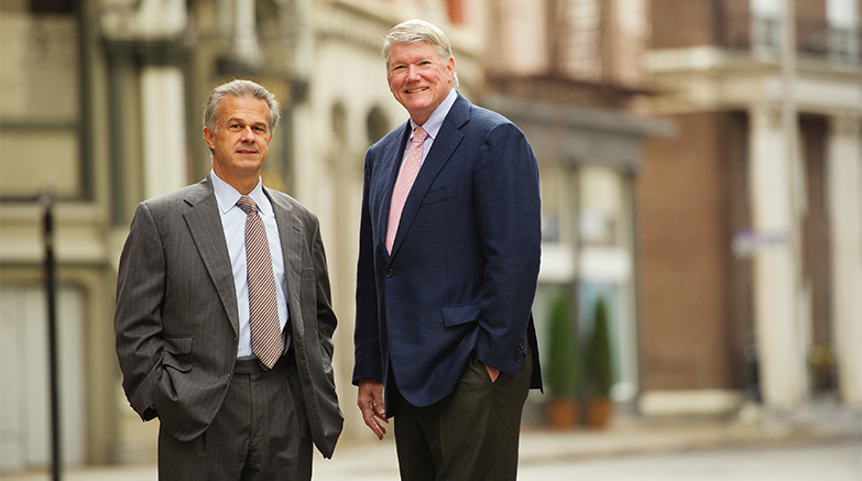 Fellow alums John Barylick (left) and Chip Babcock found themselves on different sides of Station fire lawsuits.