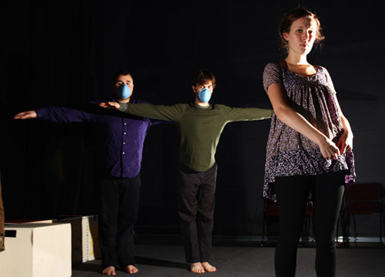 In a scene from The Wild Place, written by CFA theater professor Jon Lipsky and actress Susan Thompson, Lianne Becker (CFA’10) plays a woman who dreams she sees her pregnant mother on an airport tarmac. Helping to enact the dream are Collin Meath (CFA’10) (left) and Chris Bannow (CFA’09). Photo by Jessica Sharp (COM'08)