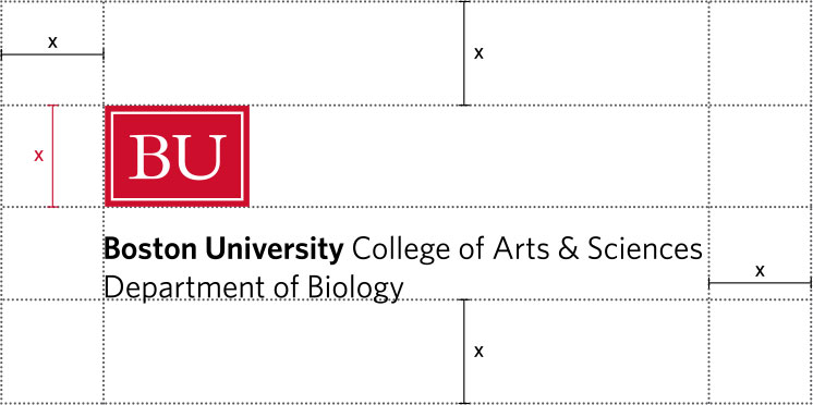 For use with an internal audience. It requires that you know “BU” is Boston University. That’s why we use it for alumni and internal audiences and more informal settings. It is also used on our websites in special digital setups, because the University plate or sub-brand logotype in the footer of the website fully identifies the University.