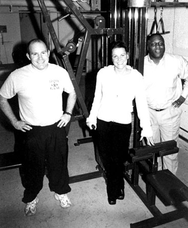 Paul Lewis (right), BU football's all-time leading rusher, and Sarah Maxwell (center), a former All-American Terrier field hockey player, recently wrote a letter to the BU Athletic Department requesting the donation of any exercise equipment the University could spare to Dorchester's Northeastern Family Institute (NFI) Center. Lewis (CAS'85) and Maxwell (CAS'90, GRS'93) are administrators at the center, which provides a home and schooling to about 60 teenagers who have been placed in the custody of the Massachusetts Department of Social Services. The Athletic Department donated a Samson lat pull-down and row machine and a bench and squat rack, worth about $1,600, according to Glenn Harris, BU's strength and conditioning coach (left). The gift helps revamp the NFI Center's recreation room, which had featured only a few free weights. "Now our residents have a place where they can go to get in good shape, improve their spirits, and have an outlet for expressing their anger and letting off some steam," says Lewis. "A lot of the young people who come here have had poor self-esteem for a long time, and creating a fitness program is one way to help them feel better about themselves. In the future, we'd love to have BU athletes visit us occasionally and give a demonstration on how best to work out." Photo by Sarah Zenewicz |