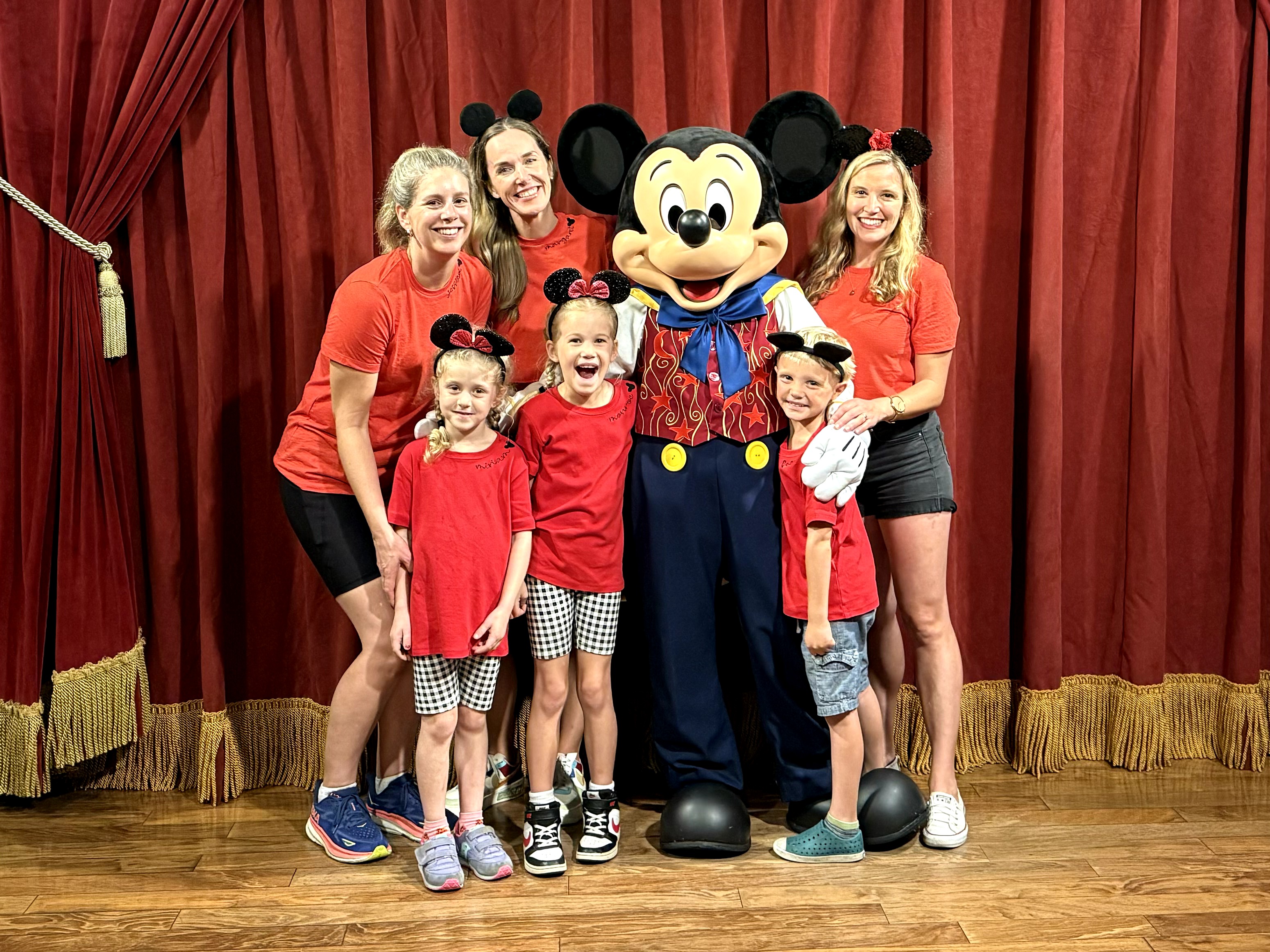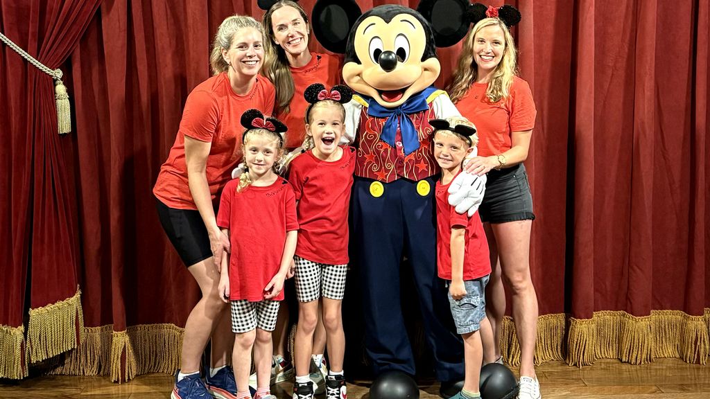 Jessica Fischburg Tripicco (SHA’08) of Glastonbury, Conn., (from left), Margaret (Bermingham) Black (CAS’08) of Dallas, Tex., and Robin Lagorio (CAS’08) of Alameda, Calif., reunited at Disney World in Orlando, Fla., in 2024, with their eldest children.