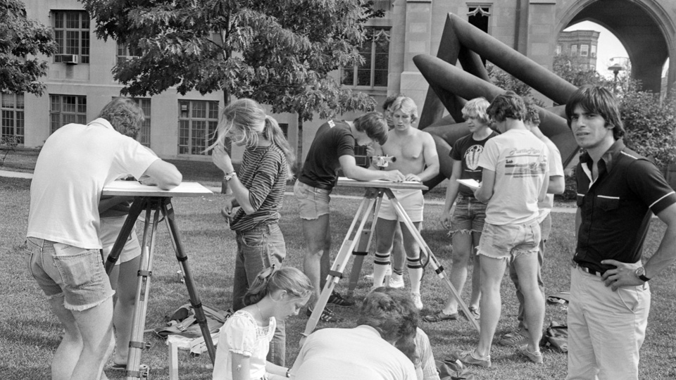 The geology students in your photo are doing a plane table and alidade experiment to site elevations of objects on the mall. This is a basic geologic exercise that all students learn, typically in a field course. My wife, a 1979 BU geology graduate, and I learned these skills from C. W. Wolfe, the late, great BU professor of geology. I went to Salem State University, where Wolfe taught after he retired from BU. Our field camp was also open to BU students, which is where I met my wife. Rich Cerbone