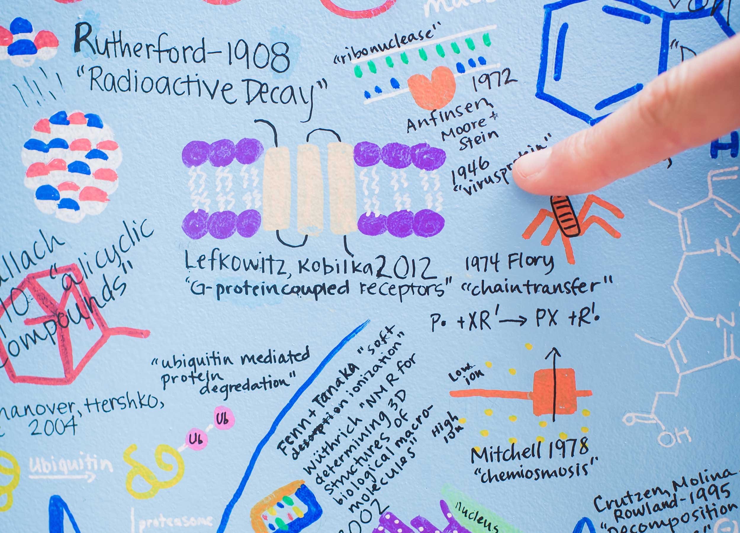 Painted robin’s-egg blue and covered with the chemical structures for dozens of molecules, this piano makes art out of science. It was decorated by the CAS-based Beeler Research Group as part of Street Pianos Boston 2016.